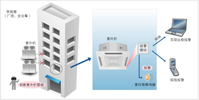 空调室外机中放置了价值较高的压缩机,铜管等。往往成为不法分子的偷盗对像。三菱重工海尔在空调机的管路系统中中加了压力检测设备和报警设备,室外设备一旦被盗,压力检测设备会把压力异常(空调被盗)的信息传递到报警设备上,报警设备即实施本地和远程(网络报警,短信报警)两种报警形式,能及时制止他人的犯罪行为,减少财产损失。